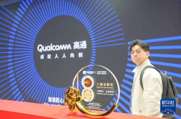 11月6日,参观者在第八届进博会技术装备展区高通展台体验XR设备。新华社记者 张子彧 摄八届进博“全勤生”高通的展台已成为展示与中国生态伙伴合作成果的“样板间”。今年的高通展台上,“我们一起 成就人人向前”的参展口号十分醒目。“希望人工智能在各行各业都能得到快速发展,推动‘成就人人向前’。”高通公司中国区董事长孟樸表示,从5G起步,到如今5G与AI在多个领域深度融合,进博会见证了高通在技术上的持续创新,也展现了高通携手中国产业伙伴所取得的合作成果。