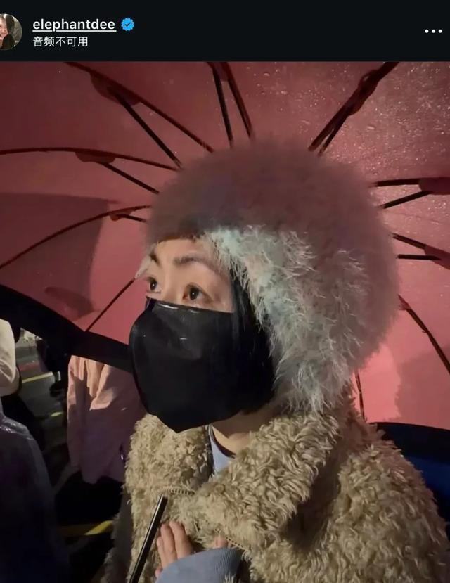 照片里的小S穿着毛茸茸的外套和帽子,一只手撑伞一只手放在胸口,眼神真挚悲伤。不用猜,她应该是戴着姐姐的骨灰项链来的。